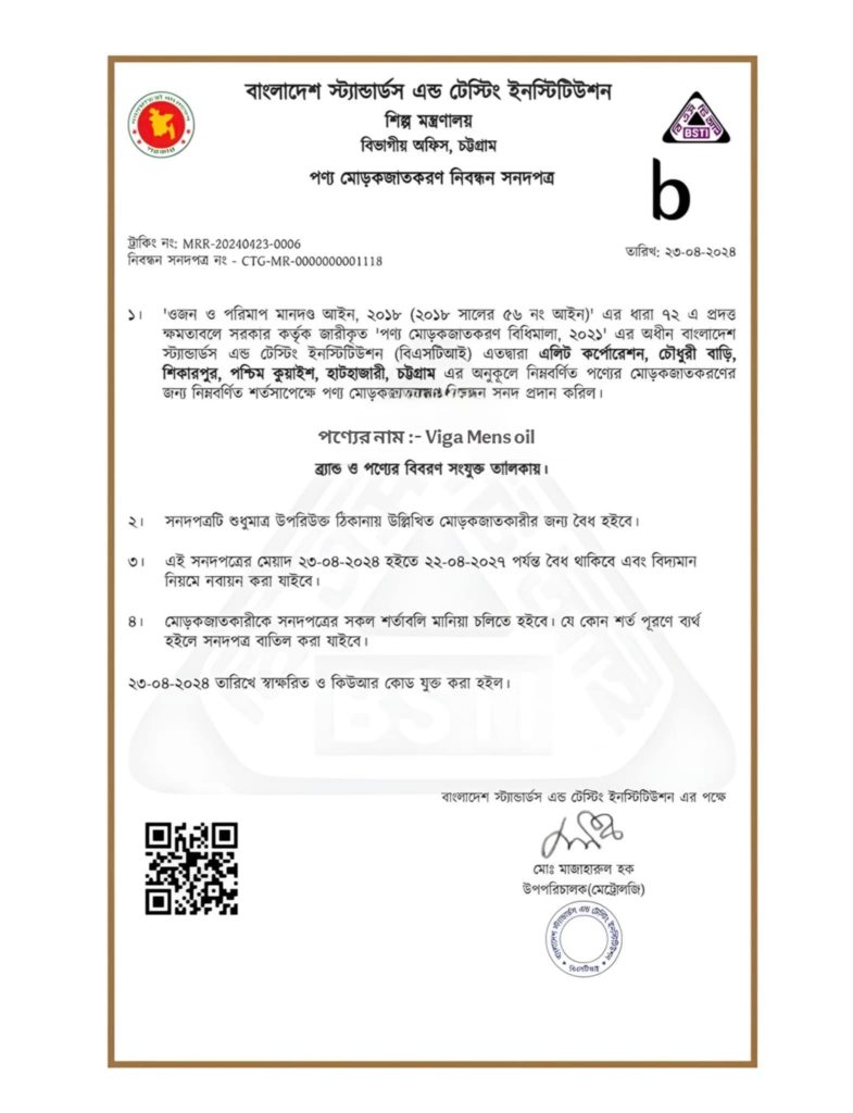 Viga Mens Oil বাংলাদেশ সাইন্সল্যাব থেকে পরীক্ষিত। এটি ব্যবহারে কোনো পার্শ্ব-প্রতিক্রিয়া নেই